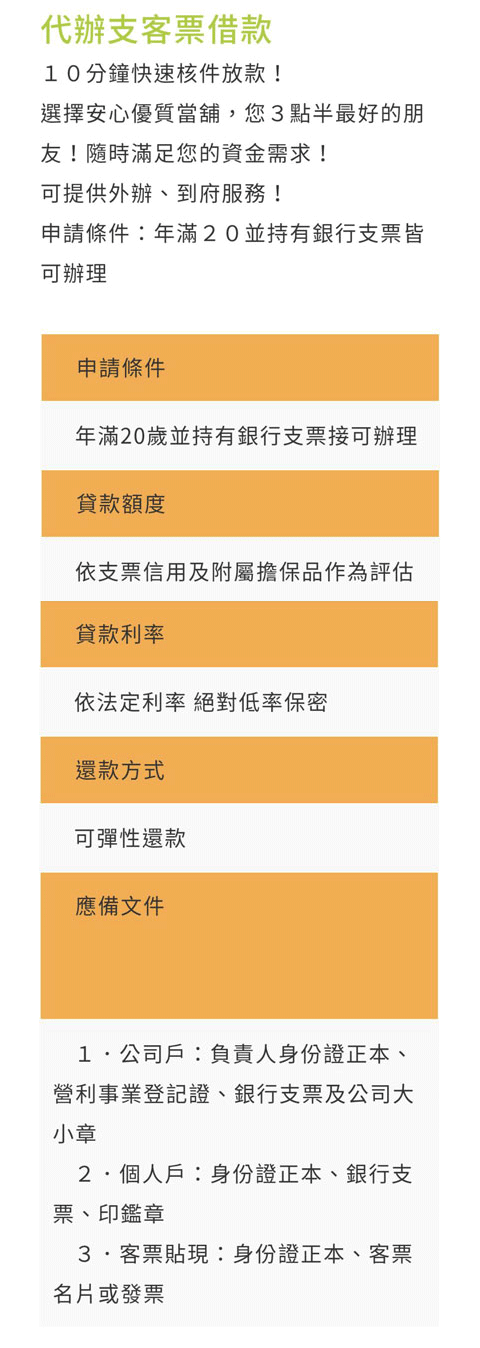 嘉義優質當鋪政府合法立案,正派經營有保障,專業提供公司企業週轉借款,工程款/押標金,房屋土地一二胎借款額度高隨到隨辦,手續簡便快速撥款,讓您融資週轉不必看臉色,隨借隨有靈活鈔好借,三點半支票換現金,生意人/各行各業支票借款,條件寬鬆好辦理,資金週轉更靈活。